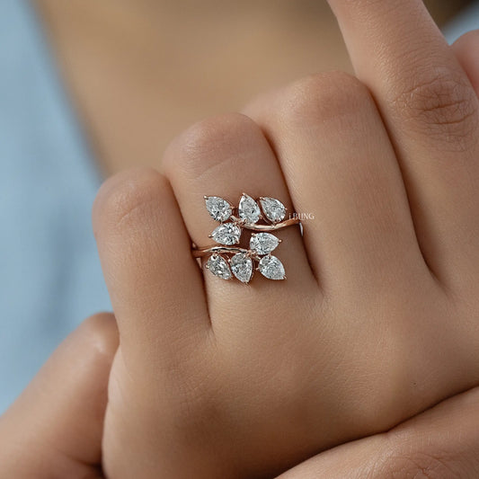 A cluster ring is made up of several tiny diamonds or gemstones that are arranged tightly together to give the appearance of a single, larger stone or a complex design. In comparison to a single huge diamond, this configuration gives remarkable sparkle and dramatic impact at a more reasonable price point.