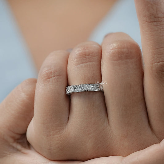 The ideal diamond size for a dainty wedding band usually falls between 0.01 and 0.05 carats per stone. While still providing glitter, these tiny diamonds preserve the delicate, understated appearance that characterizes dainty styles.