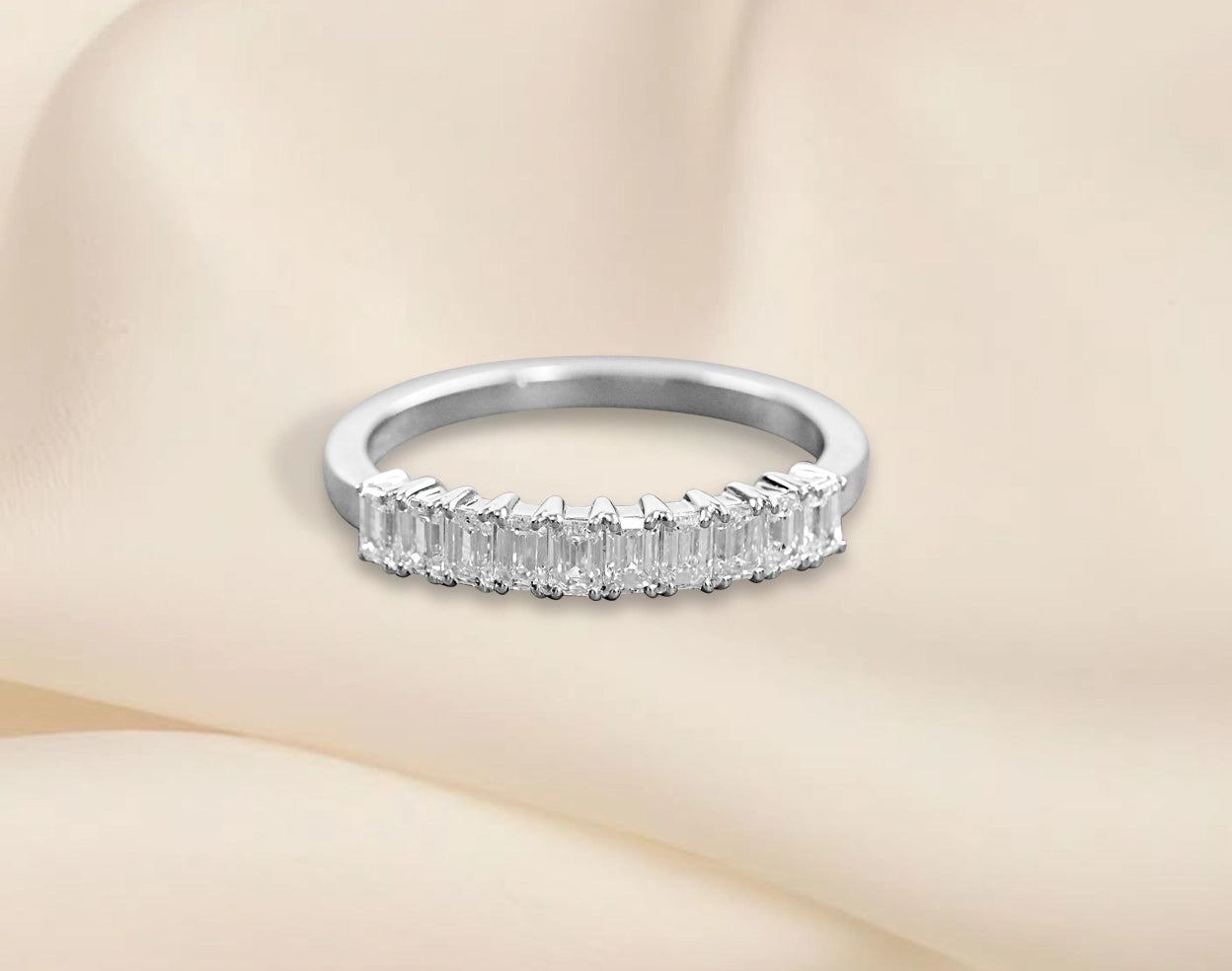 Compared to round cuts, emerald cut wedding bands are frequently less expensive per carat. However, because of their open facets, they might need diamonds with superior purity, which could increase the cost. The wedding band style, setting, and diamond quality all affect the total cost.