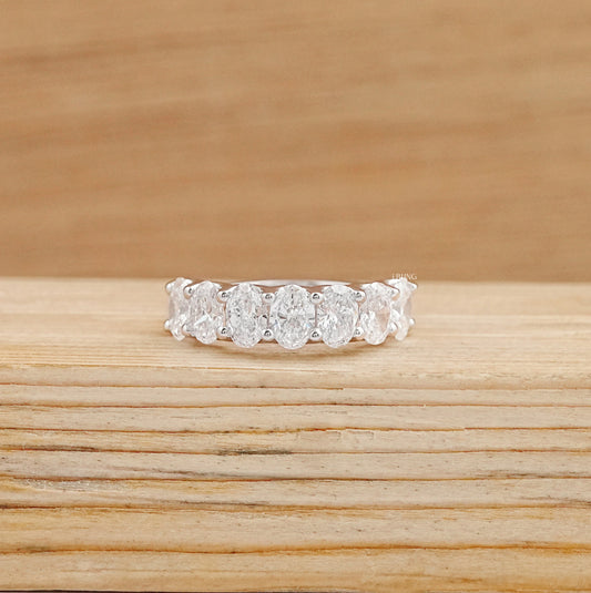 Half eternity bands feature various diamond cuts, each adding unique style and sparkle. The most popular is the round brilliant cut, known for its classic brilliance. Other common cuts include princess, emerald, baguette, pear, oval, cushion, and asscher cut loose lab diamond.