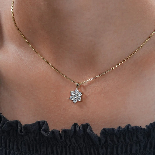 A lab-grown diamond necklace featuring a diamond created in a lab rather than mined from the earth. It offers the same beauty and sparkle as a natural diamond but is more affordable, ethical, and environmentally friendly.