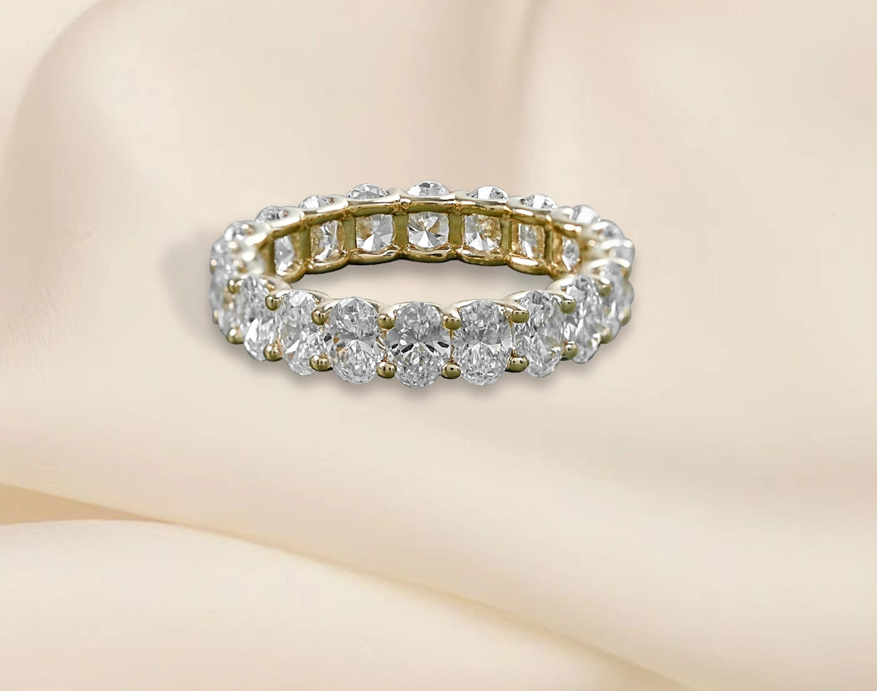 Yes, oval-cut wedding bands can be resized, particularly if they have basic settings or a plain metal band. However, with elaborate patterns like full eternity band, resizing might be more difficult.
