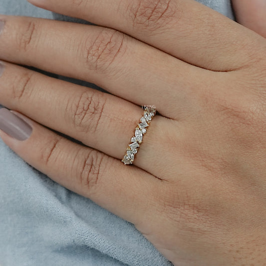 Yes, a range of diamond shapes can be used in wedding bands. Combining several diamond cuts creates individualized and striking designs, ranging from traditional rounds and exquisite princess cuts to distinctive emerald, marquise, pear, and oval shapes.