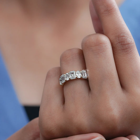 Selecting a 5 stone band is common since it represents significant events or turning points in a relationship and provides both dazzle and heartfelt sincerity. The 5 stones create a striking, well-balanced design that enhances the brilliance and sophistication of a wedding band.