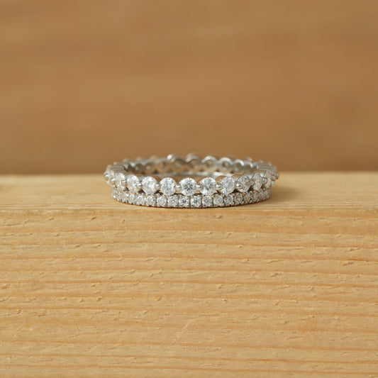 A ring with a continuous diamond circle placed around the entire band is called a full eternity diamond wedding band. Because the diamonds completely encircle the finger, a full eternity band represents unwavering love and dedication.