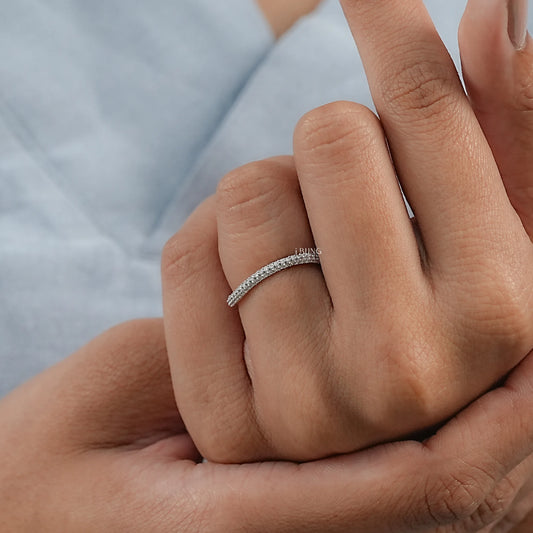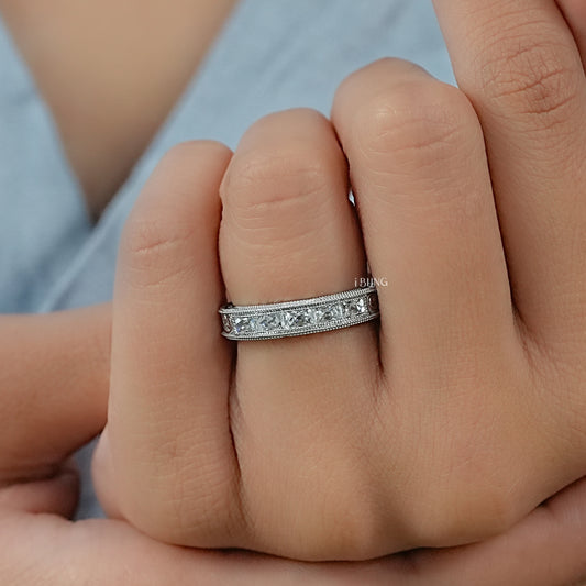 A ring with a continuous diamond circle placed around the entire band is called a full eternity diamond wedding band. Because the diamonds completely encircle the finger, a full eternity band represents unwavering love and dedication.